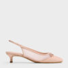 These Mulligan slingback pumps in blush pink are made with faux suede and mesh. They feature dainty bow details, low kitten heels, elasticised slingback straps and elegant almond toes. Use them to bring polish and sweetness to your special-occasion outfits.