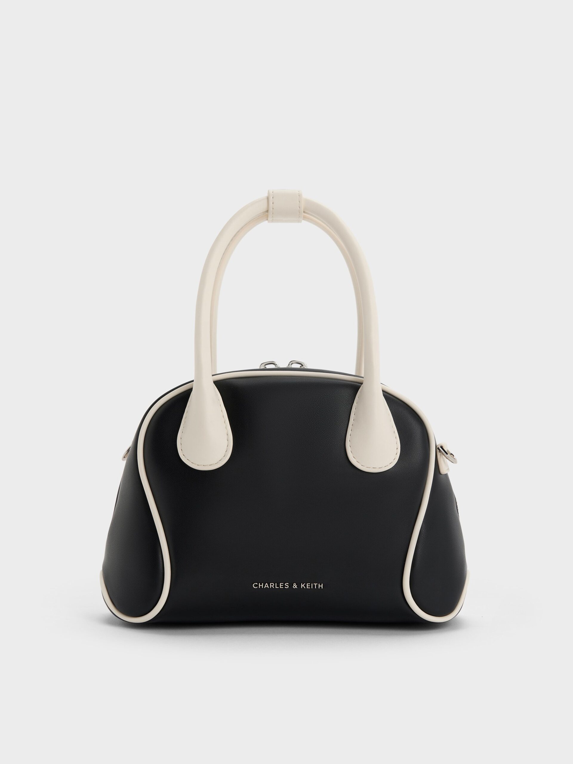 This Nelly bowling bag features a black structured body with white handles and trims. It also comes with a detachable shoulder strap. Use it to add an eye-catching graphic element to minimalist weekend looks.