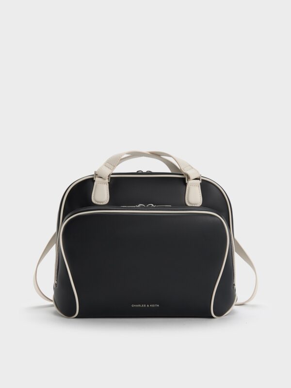 This Nelly backpack has a black body with white straps and trims. It also features a roomy front pocket and soft top handles. Carry it for hands-free convenience — it will also add a striking graphic element to all your outfits.