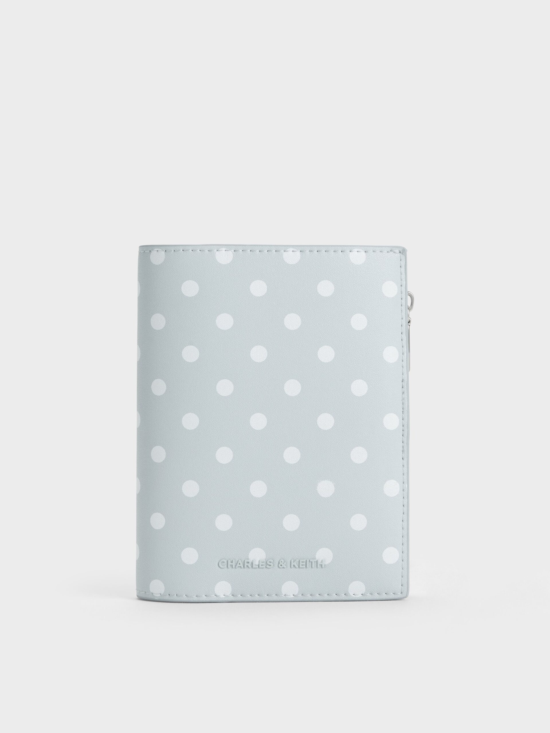This Noelle passport holder in sea-salt blue features a polka-dotted finish, a fold-over design secured by a snap-button closure, a compartment for your passport, multiple card slots and a side-zip compartment. It will keep your travel essentials and documents neat and organised.