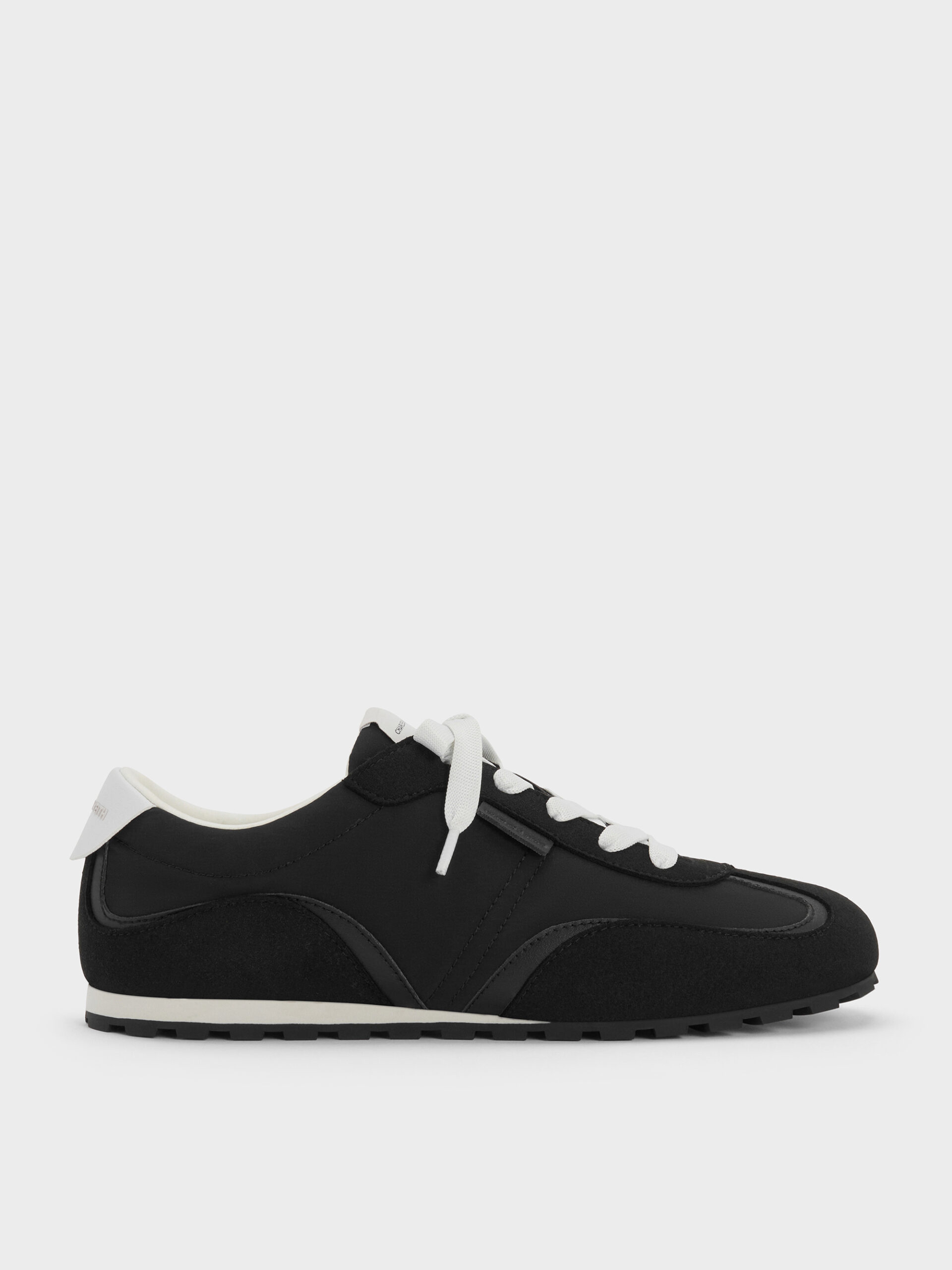 These sneakers in black are made with nylon and feature a low-top design, contrast panels, lace-up fronts and flat soles. Pair them with denim or athleisure separates for an comfortable and stylish weekend outfit.