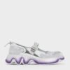 This item is part of our exclusive collaborative collection with PH5, an innovative and fashion-forward knitwear brand based in New York. Stand out in these whimsical sandals that make a big statement. Featuring an eye-catching wave-edged design and curved sculptural heels, this ankle-strap pair has lilac footbeds marked by speckled stripes. These shoes are also adorned with clip buckles and drawstring details that give them a utilitarian appeal.