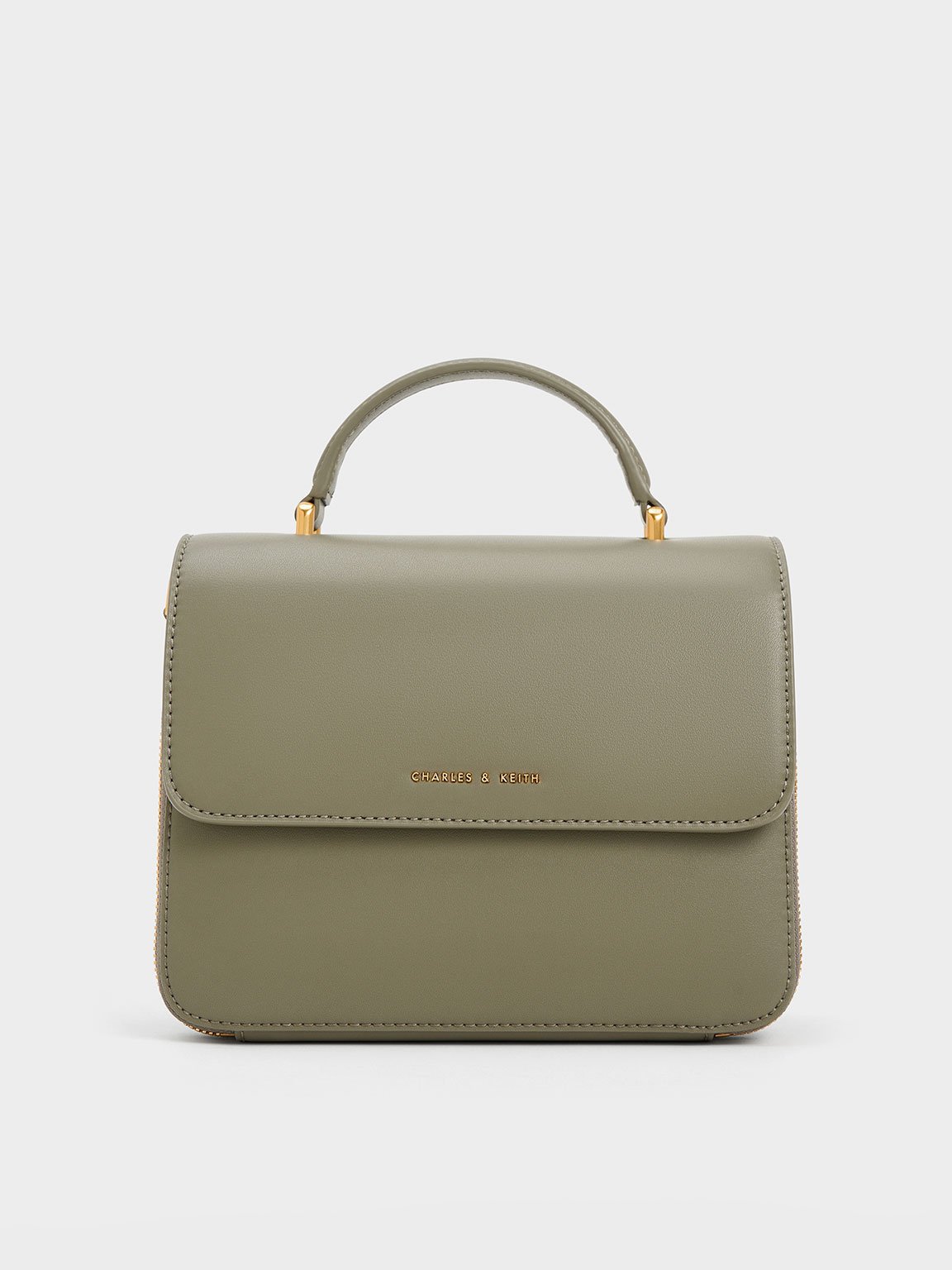 From the minimal silhouette to the elegant finish, this Octovia front flap bag is easy to love. Its classic design lets the clean lines stand out, complemented by a khaki finish and gold-toned hardware for a polished look. To add subtle visual interest, the CHARLES & KEITH logo is etched on the front. Equipped with a sturdy top handle and detachable shoulder strap, you can wear this bag in various ways for all your occasions.