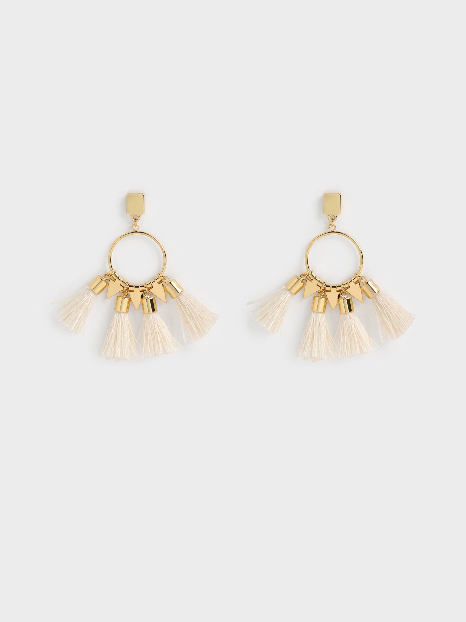 These Orelia drop earrings feature gold-tone triangle motifs contrasted with cream-white tassels for an eye-catching look. Designed to move with you, they will bring dynamic charm to boho-chic outfits.