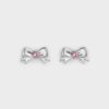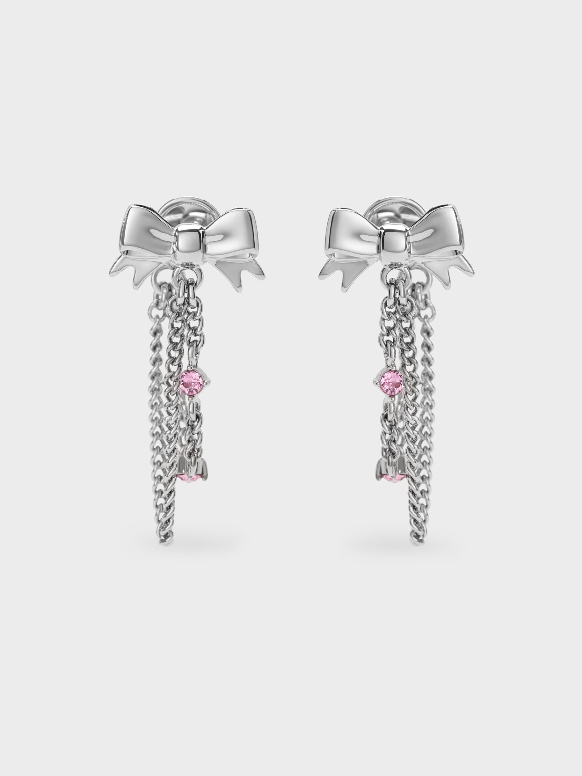 These Paige drop earrings feature a cool silver-tone finish and dainty bow motifs adorned with mini pink crystals on delicate hanging chains. Match them with the bow ring from the same range to create a refined, coordinated look.