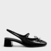 These Mary Jane slingback pumps in black feature a patent finish, dainty bows with metal-disc accents, covered round toes, adjustable straps across the vamps, slingback straps and low block heels. Let them elevate workwear looks with their classic design and subtle details.
