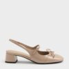 These Mary Jane slingback pumps in nude feature a patent finish, dainty bows with metal-disc accents, covered round toes, adjustable straps across the vamps, slingback straps and low block heels. Pair them with casual daytime looks for a polished yet understated aesthetic.