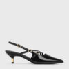 These pumps will catch the light at every angle. Featuring a high-shine black patent texture and metallic finish on the heels, this pair is understated yet impossible-to-miss at the same time. Slight tweaks to the classic slingback silhouette, like the double buckled straps across the vamps, create a contemporary aesthetic. To maximise the leg-lengthening effect, the pointed-toed style is complemented by kitten heels to give a flattering and comfortable lift to your frame.
