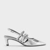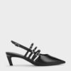 These slingback pumps in black feature a patent finish, a triple-strap design, pointed toes and kitten heels. Wear them with relaxed linen trousers to channel understated elegance that is ideal for weekend markets or informal meet-ups.