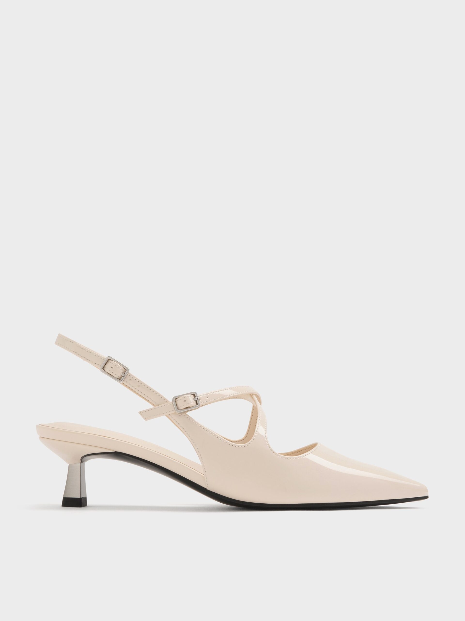 Swap your regular pumps for these kitten heels that are perfect for all-day wear. They will add visual interest to any outfit with their eye-catching crossover straps, while the glossy patent cream finish will elevate your everyday look with a touch of luxury.