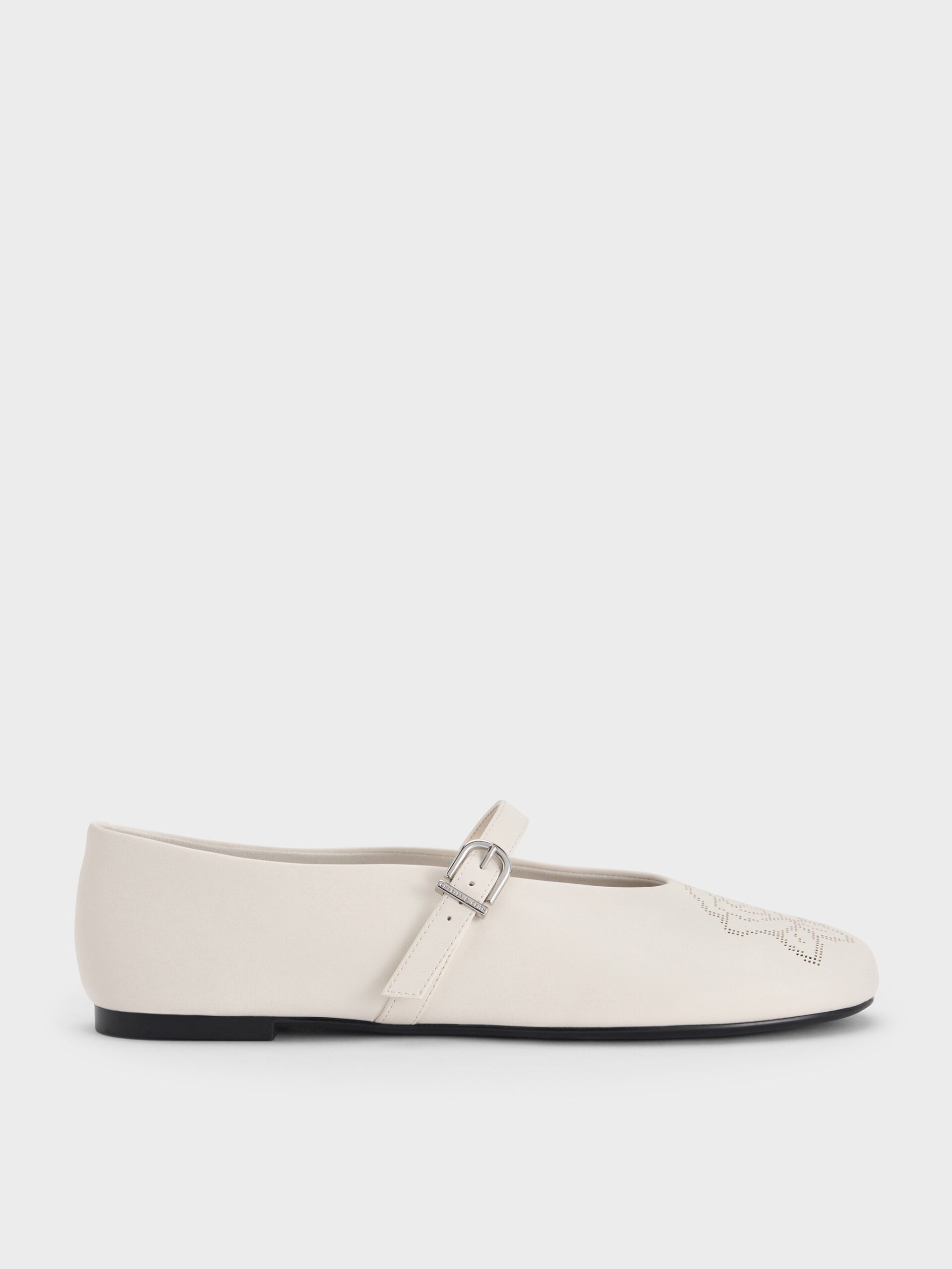 Featuring a rounded-toe silhouette, these Mary Janes in clean chalk stand out with the perforated rose motifs on their uppers. Their buckled straps can be adjusted to ensure a comfortable and secure fit, while their high-vamp construction exudes an effortless elegance.