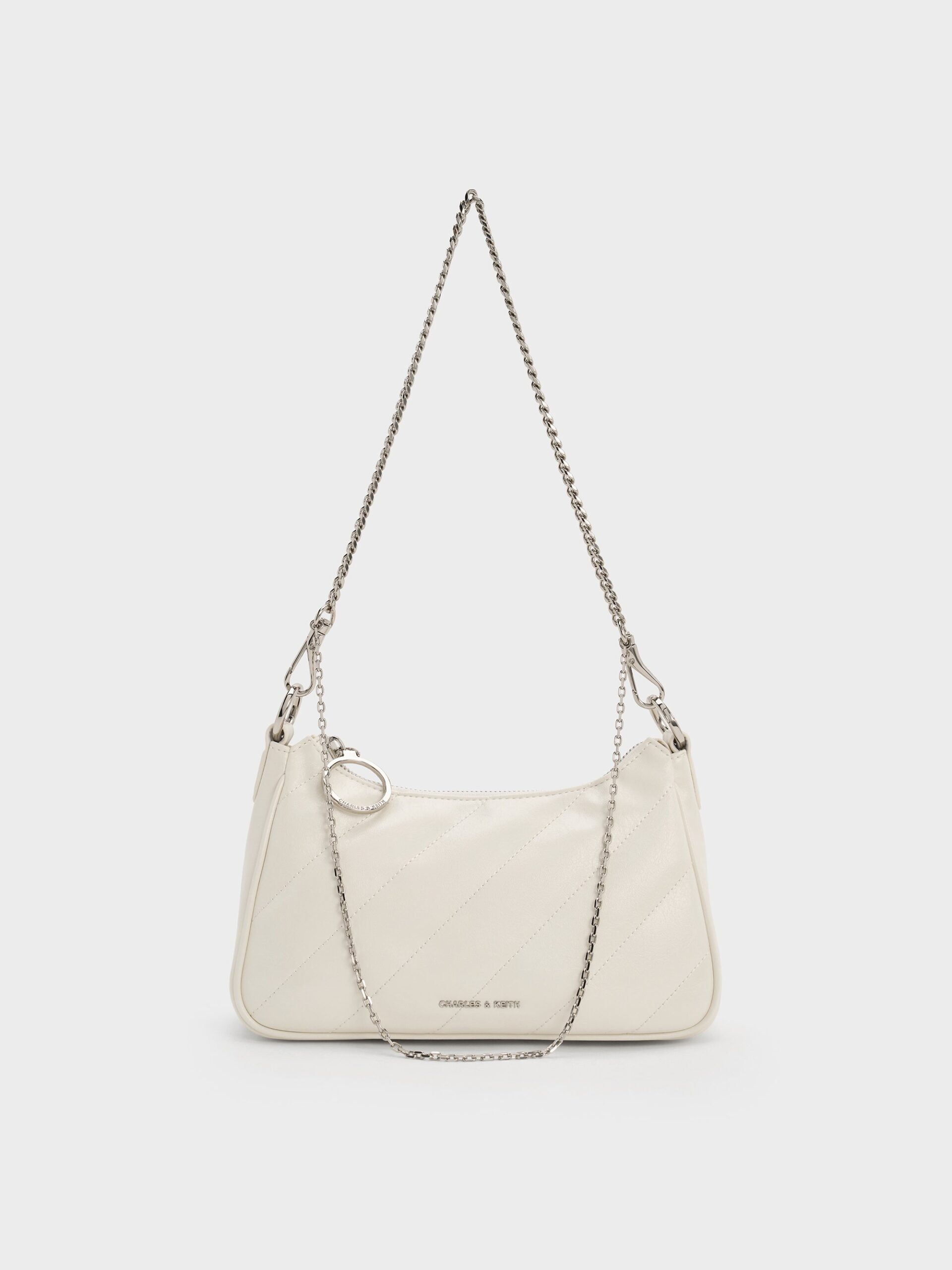 This Philomena crossbody bag in cream features a crinkle-effect finish, a trapeze silhouette, an edgy double-chain strap and a detachable shoulder strap. Carry it to elevate your everyday outfits with subtle shine and modern elegance.