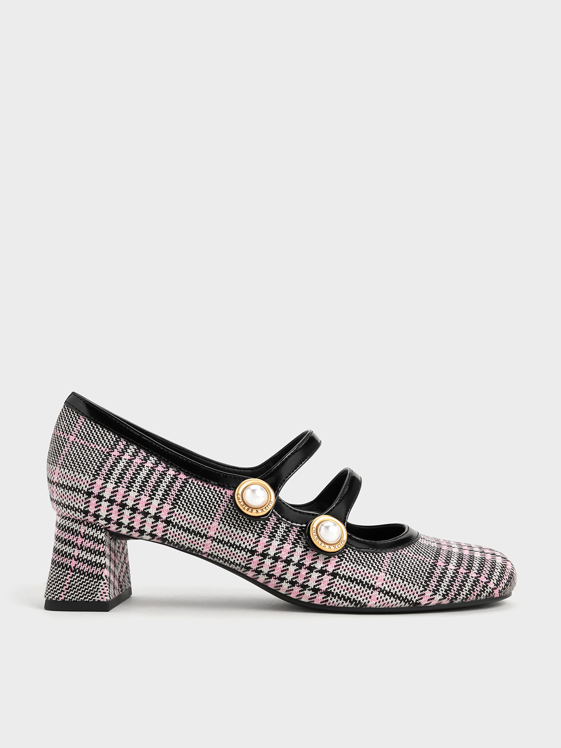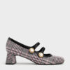 Build your outfits from the ground up with these Mary Jane pumps. The eye-catching houndstooth finish instantly refreshes the classic school-girl shoe with a vintage charm. It also features distinctive double straps with pearl embellishments to complete these shoes with an elegant touch. Resting on sturdy block heels, they offer a modest height lift without compromising comfort.