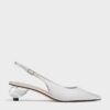 These slingback pumps in silver are made with satin and feature pointed toes, slingback straps and sculptural crystal heels. Wear them with sequinned dresses to create a bold, statement-making evening ensemble.