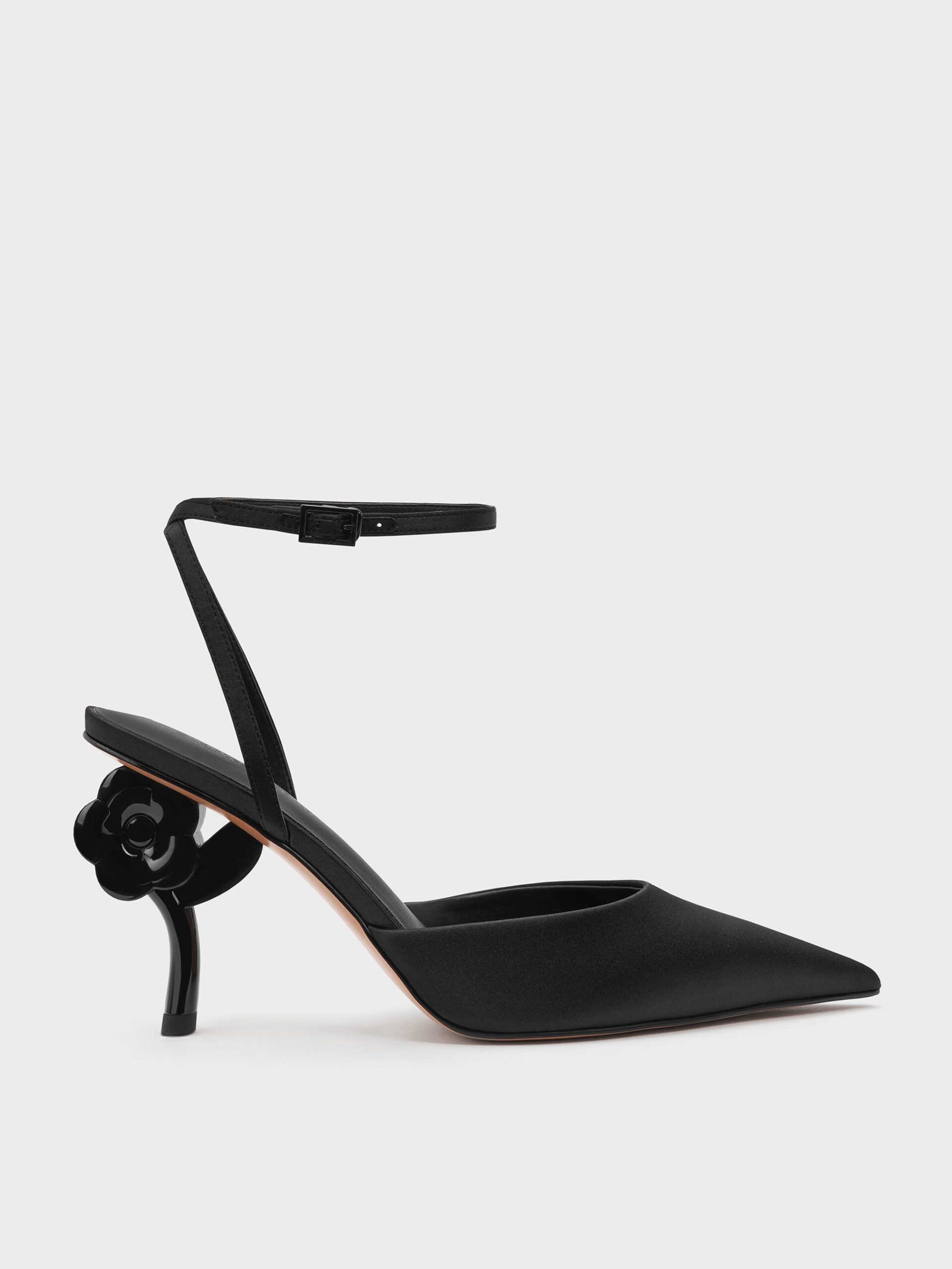 These pumps in black feature pointed toes, flower-shaped heels, and adjustable ankle straps. They will level up casual edits with their striking details and elegant design.This product contains recycled material.
