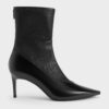 These ankle boots in black feature pointed toes, back zips, stiletto heels and narrow shafts. Wear them with draped or voluminous clothes to create a balanced look consisting of sharp lines and soft layers.