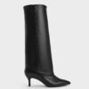 These ankle boots in black feature pointed toes, back zips, stiletto heels and narrow shafts. Wear them with draped or voluminous clothes to create a balanced look consisting of sharp lines and soft layers.