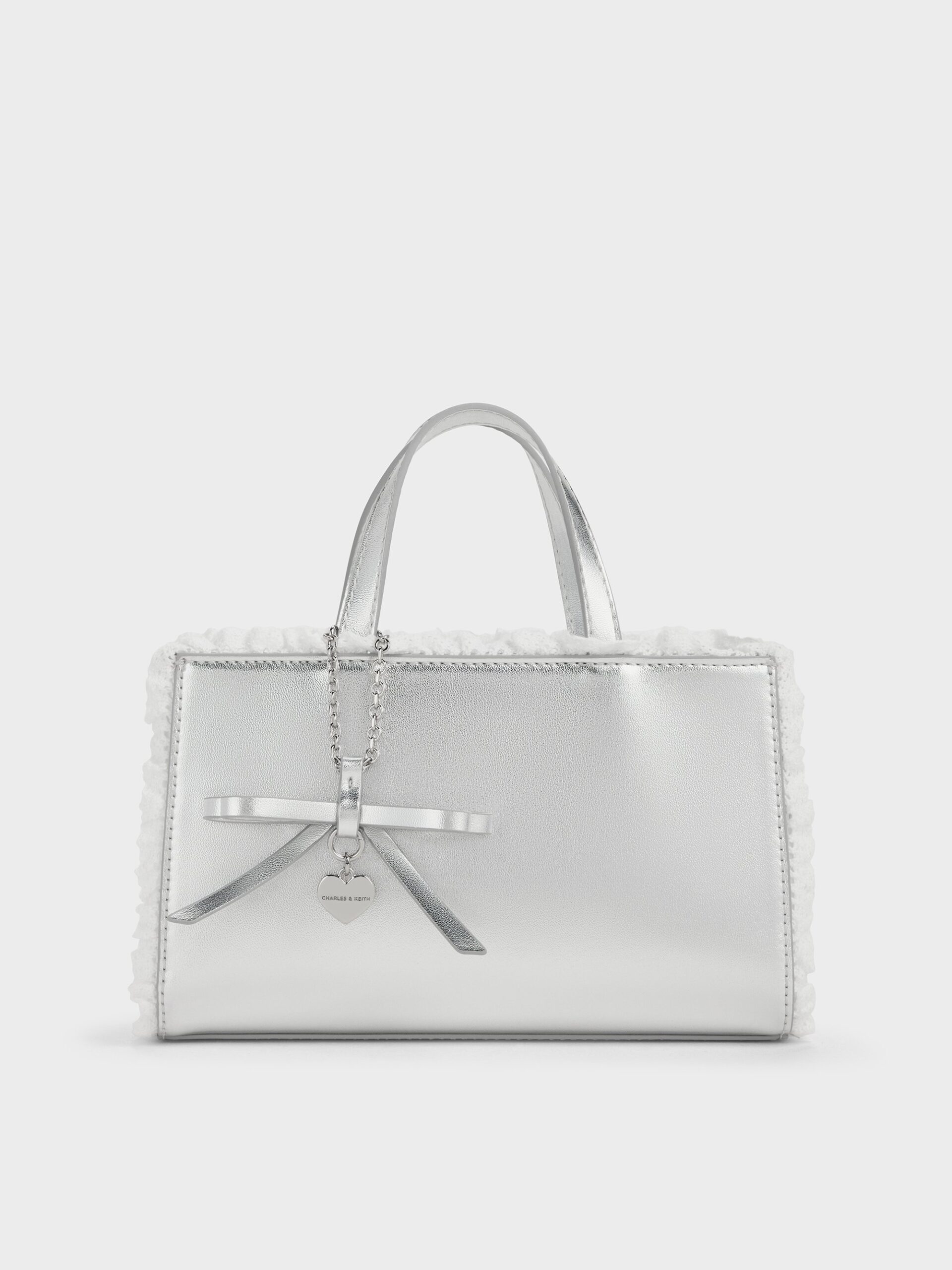 This Raina tote bag in silver is made with satin and features a boxy silhouette with a shimmery metallic finish, lace trims, double handles and a cute bow-heart charm. Use it liven up both your workday and weekday ensembles.