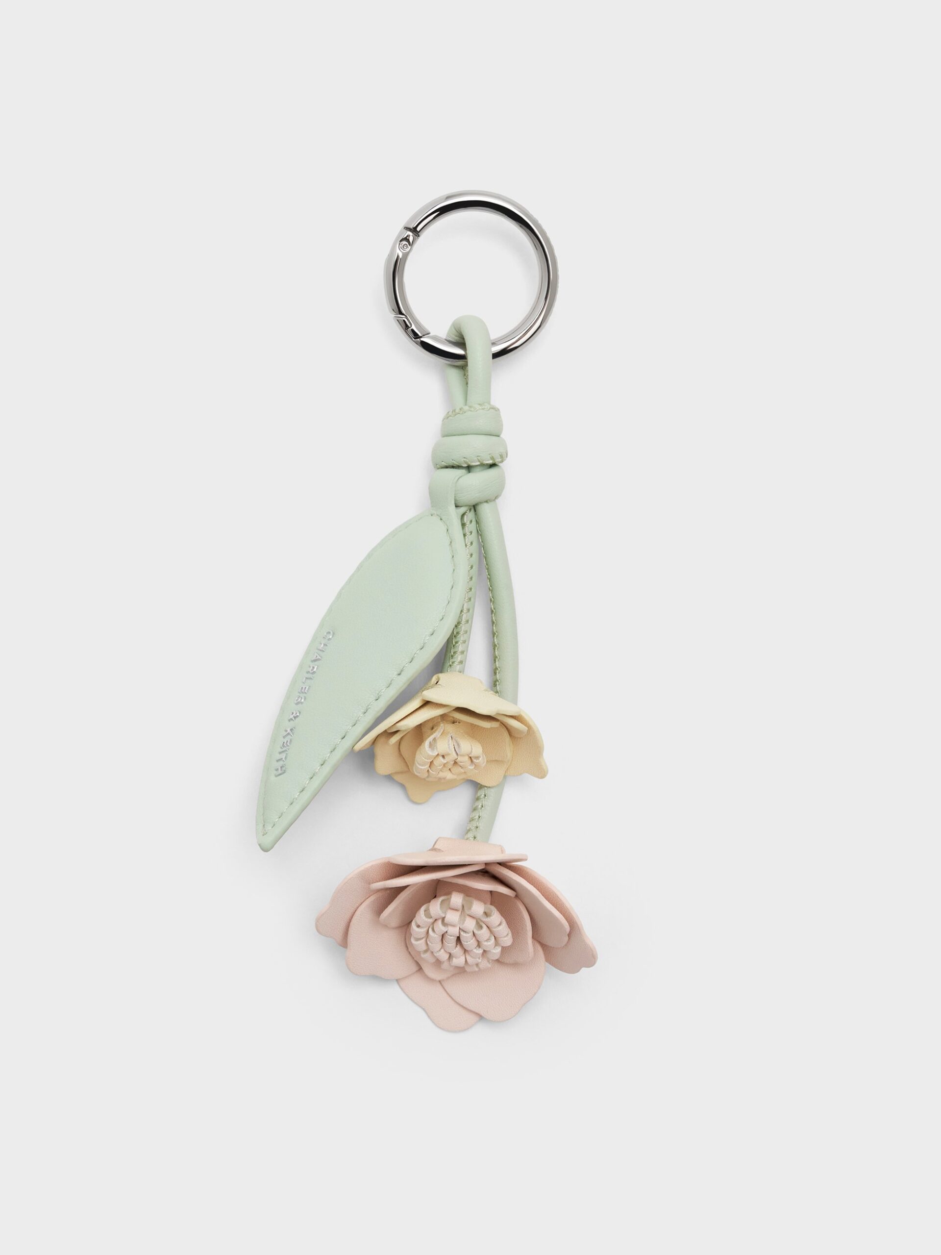 This whimsical and feminine charm and keychain features a cream rose, a pink rose and a mint-green leaf that are made with smooth faux leather. Use it to add a touch of charm and elegance to your everyday routine.