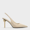 These slingback pumps in gold are made with satin and feature pointed toes and crystal embellishments on their sculptural ball heels. Match them with relaxed tailoring to create stylish yet understated workday looks.