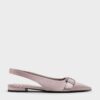 These slingback flats in mauve are made with satin and feature crystal-embellished buckles and pointed toes. Pair them with light knits and linen culottes to build a day ensemble that feels breezy yet distinctly sophisticated.