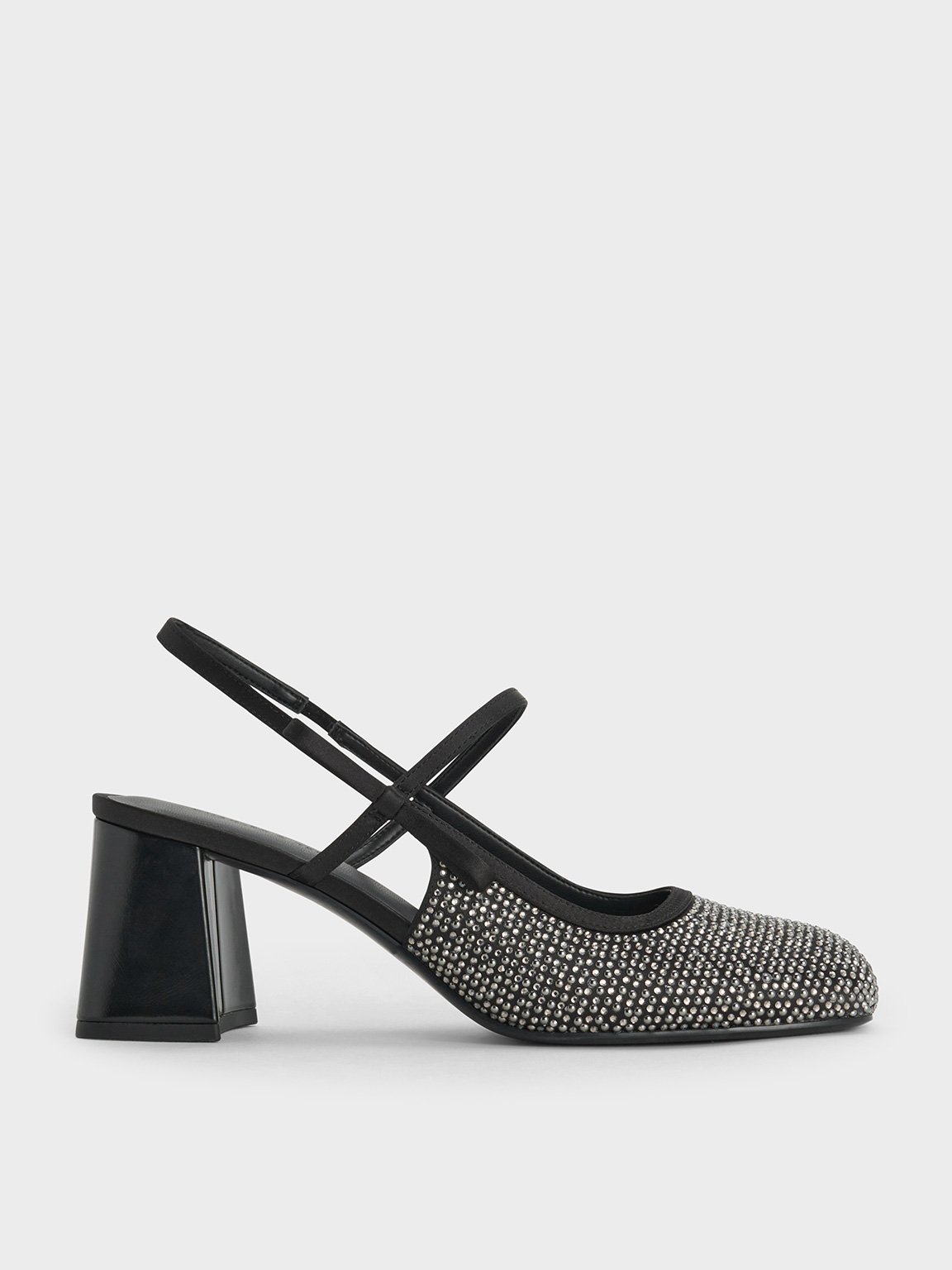 Bold and distinctively feminine, these are not your typical Mary Jane pumps. They feature a black satin base with crystal embellishments all over, boasting an eye-catching design that will elevate any look. Set on sturdy block heels, they will also provide a noticeable height boost.