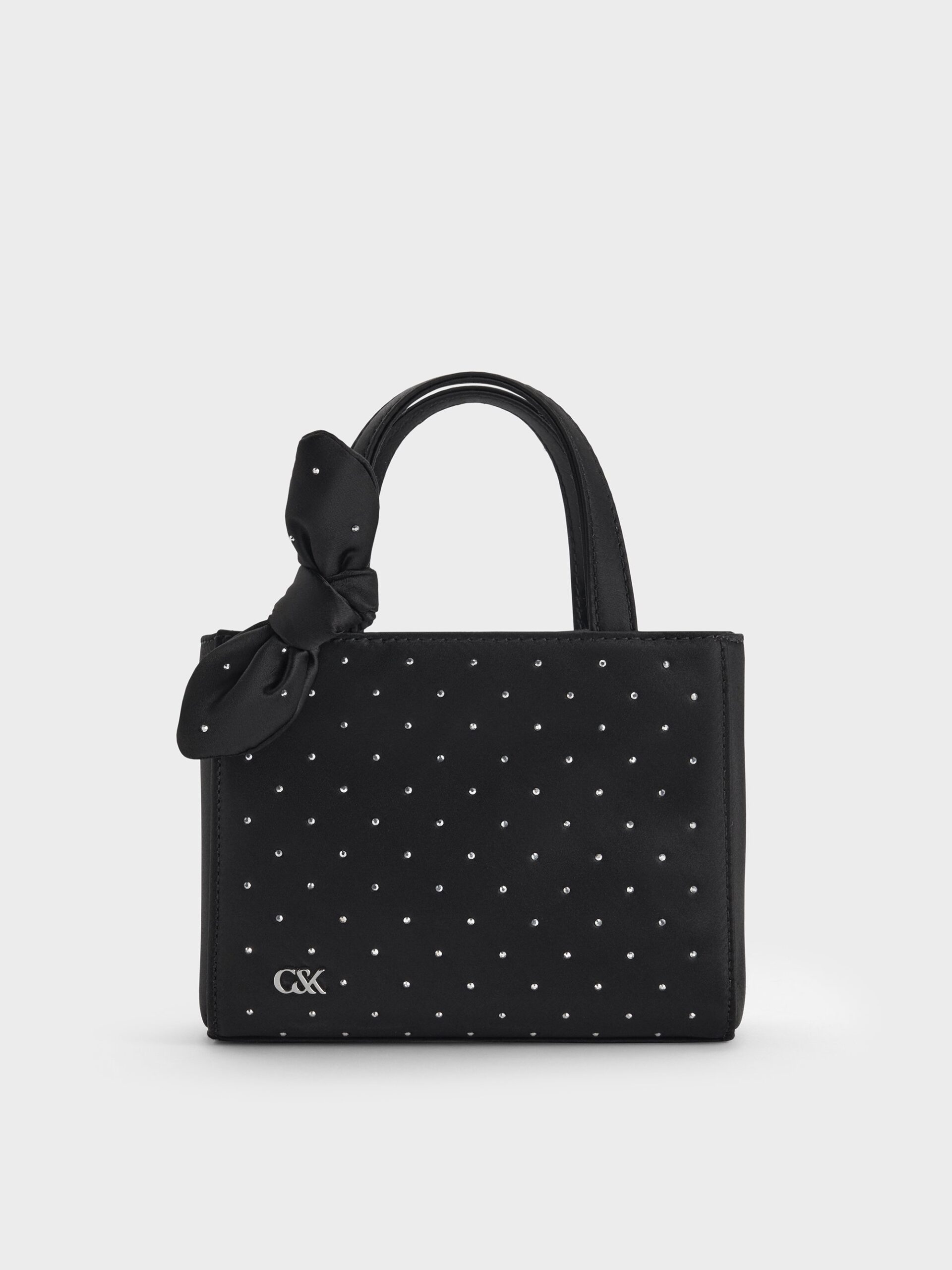 A classic little black bag with an elegant twist, this piece features a sleek satin finish embellished with little shiny studs for added sparkle. The knotted bow detail on the top handles adds a charming touch. Perfect for nights out, clip on the chain strap whenever you need to keep your hands free.