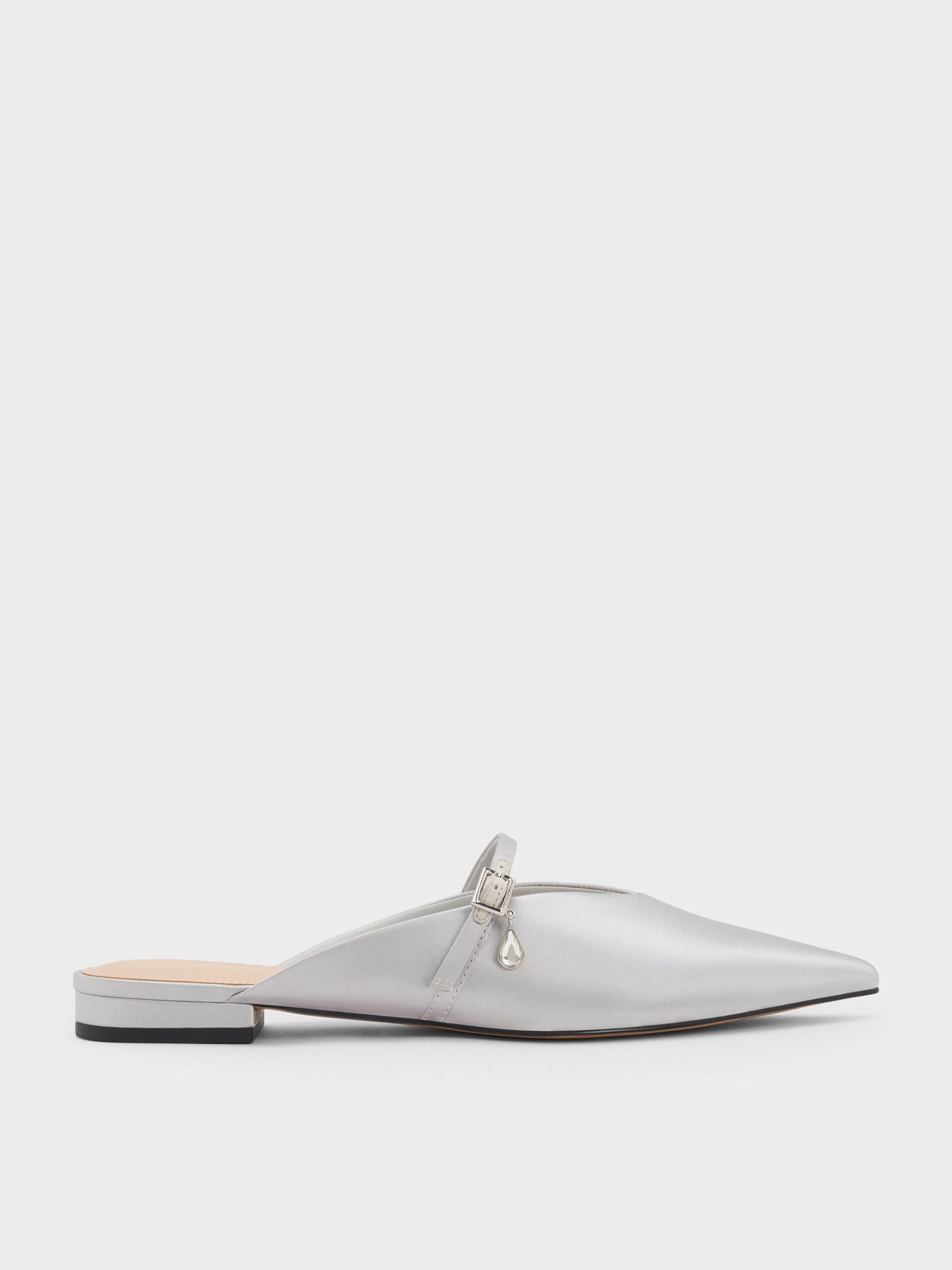 These flat mules in silver are made with satin and feature dangling teardrop crystals, slim buckled straps and pointed toes. Pair them with midi skirts for a casual ensemble that still feels considered and put-together.