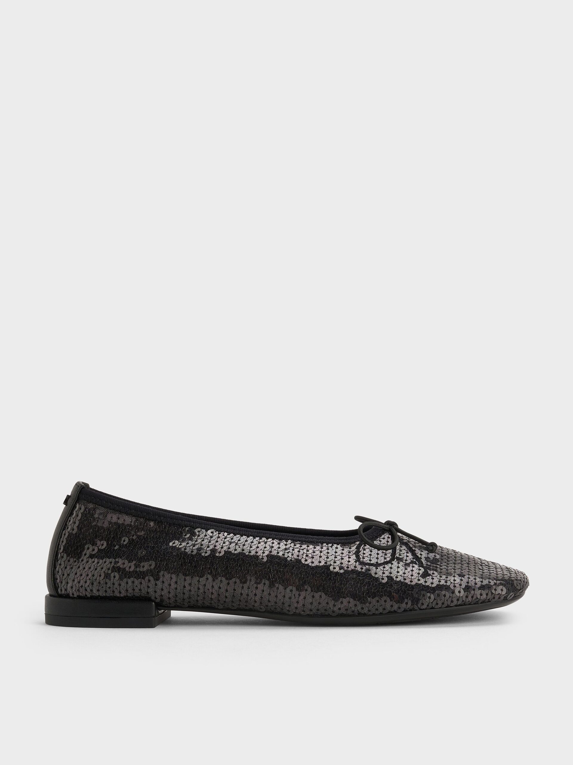 Incorporate a little glamour into your everyday life with these ballet flats. The sequinned mesh adds dimension to the black finish, giving it a distinctive appeal. Adorned with bow ties, they are a bold take on the feminine style.