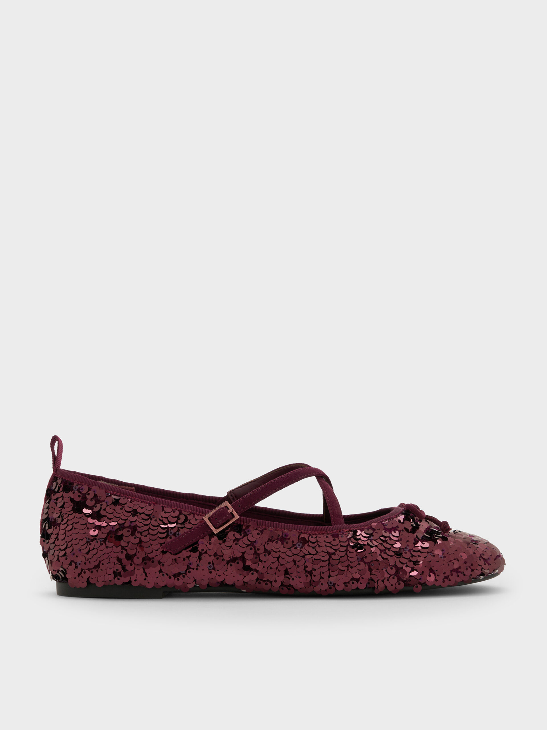 These Mary Jane flats in burgundy feature sequinned uppers, crossover straps and dainty bows. Use them to inject rich colour and eye-catching shine into your festive looks — these shoes will make you stand out at any party.