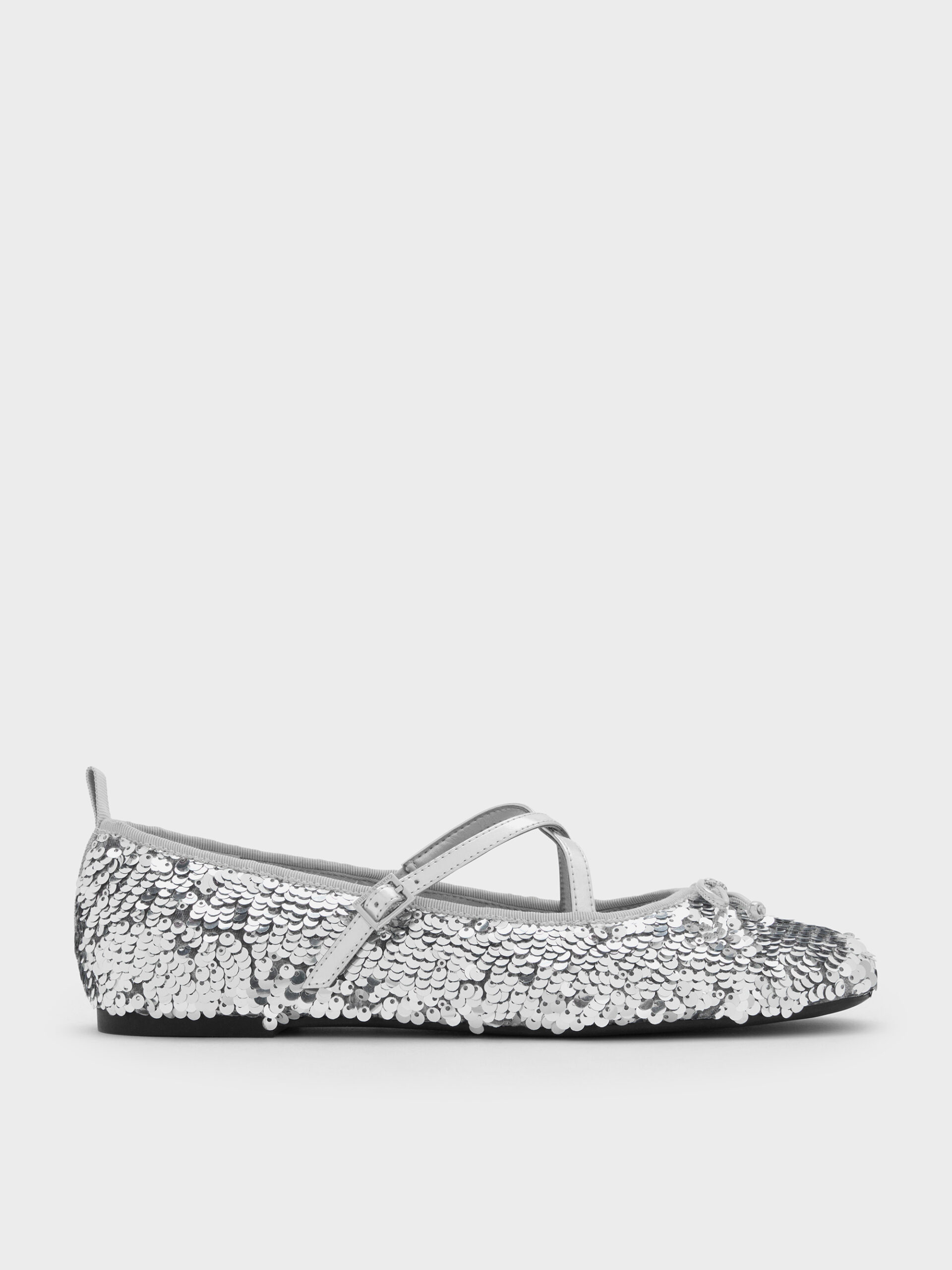 These Mary Jane flats in silver feature sequinned uppers, crossover straps and dainty bows. Wear them to bring a touch of festive shine and polished playfulness to both everyday outfits and party looks.