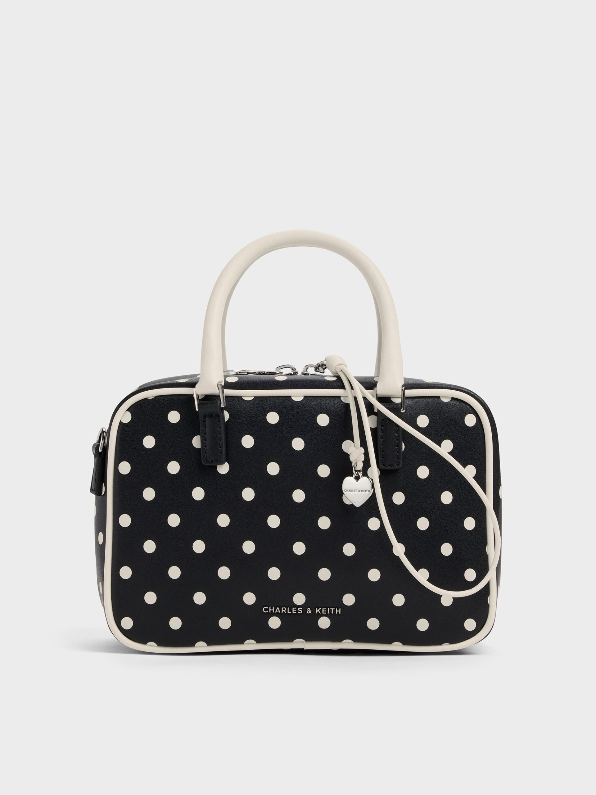 This Sianna bowling bag in black features a rounded boxy silhouette, a polka-dotted finish, contrasting double handles, a double-zip closure and a detachable shoulder strap. Let it elevate neutral-toned outfits with its playful and practical details.