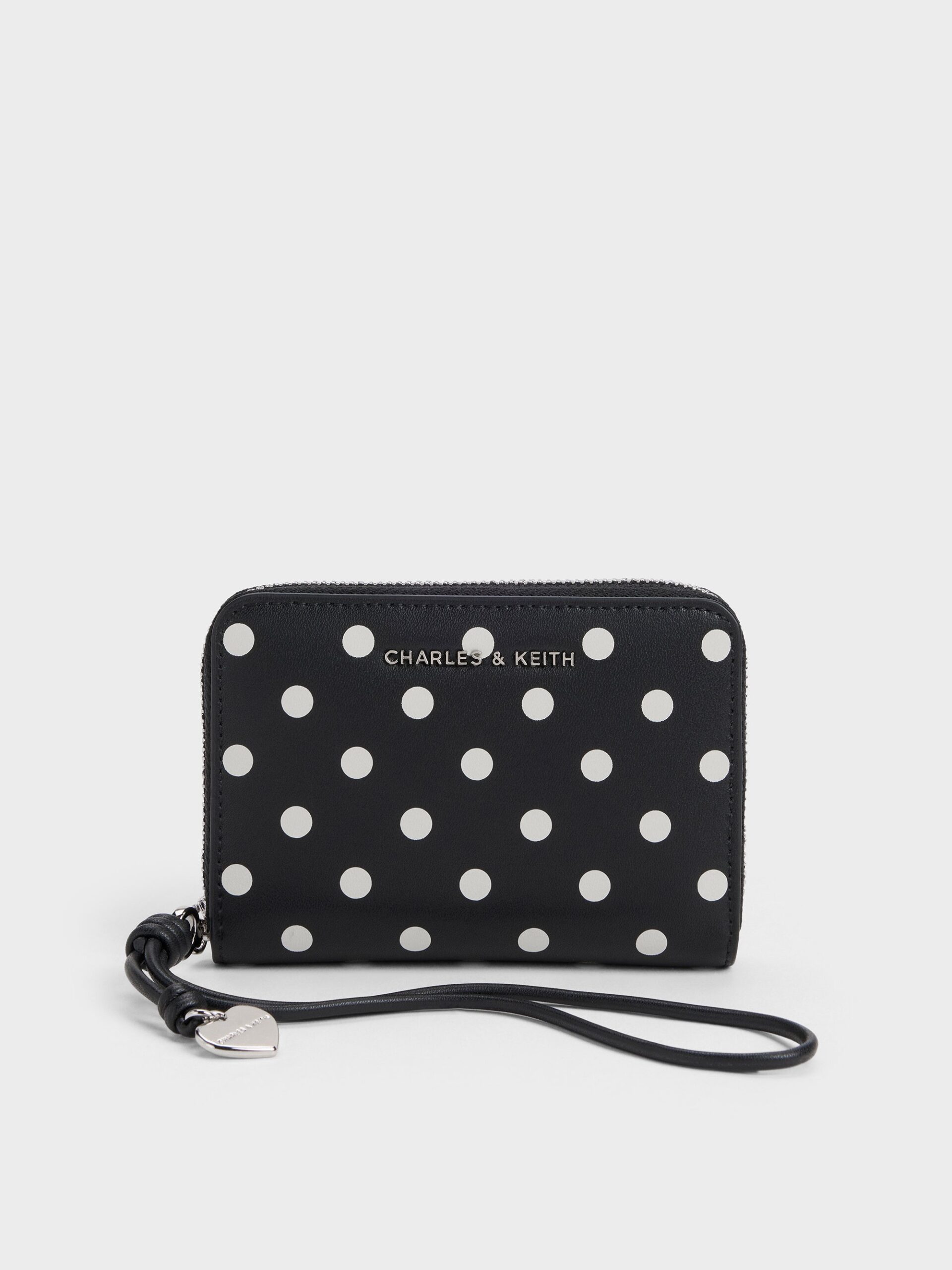 This Sianna wristlet in black features a polka-dotted design, a non-detachable knotted strap, a sweet heart charm and a zip-around closure for security. It offers hands-free convenience during quick errand runs and lunches.
