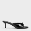 These Sonali heeled thong sandals in black feature a glossy finish, kitten heels, open round toes and dainty bow details. Wear them to add a feminine touch to both your workday and weekday edits.