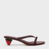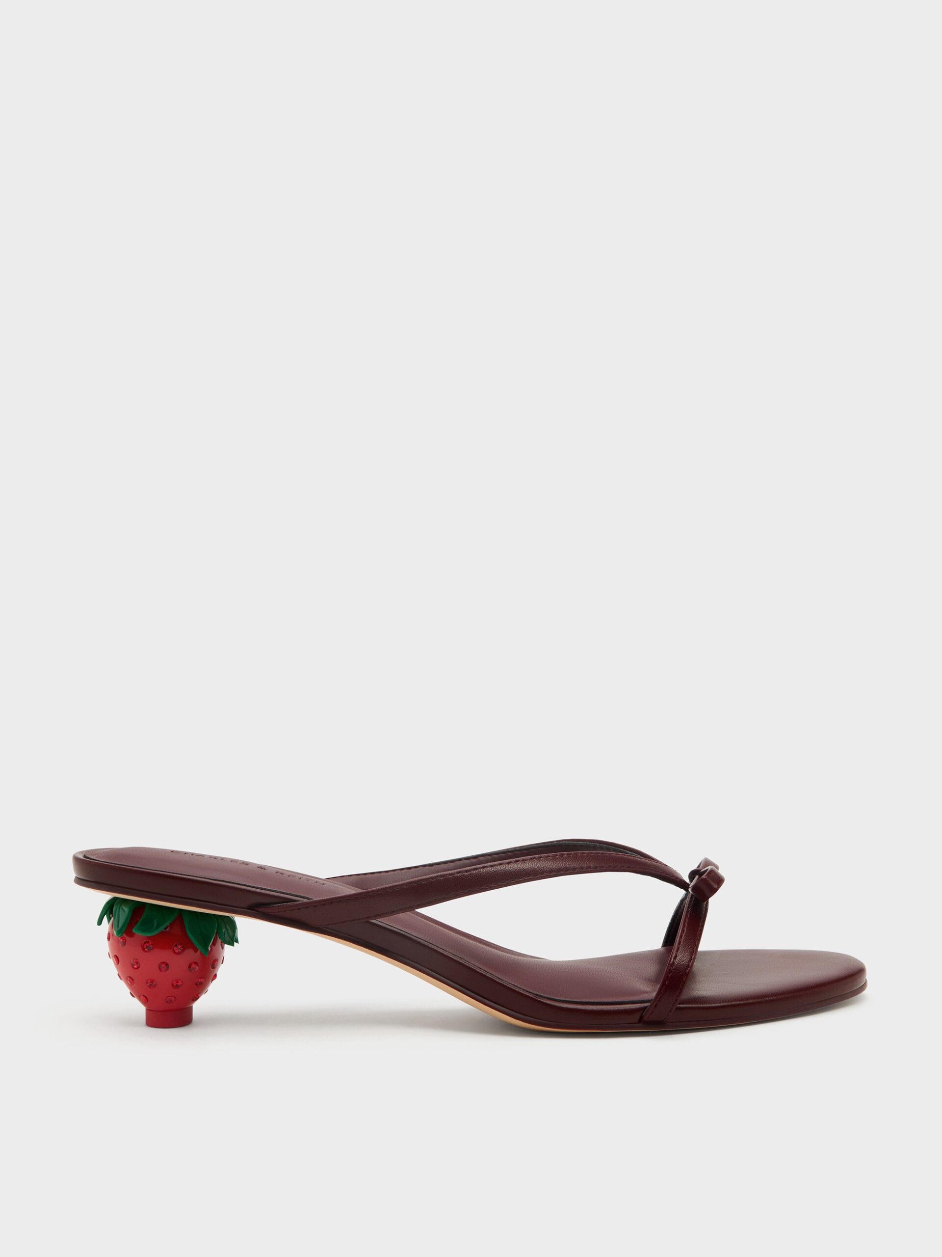 These Sonali mules in burgundy feature slim strappy uppers adorned with dainty bows, open toes and whimsical strawberry-shaped heels. Let them elevate light knits and denim for a fun and effortless weekend look.