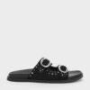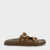 These flatform sandals in brown are made with faux nubuck leather and feature a classic double-strap design embellished with gold-tone studs, shiny oval buckles, contoured footbeds and open round toes. Wear them to add a subtle boho-chic edge to relaxed everday outfits.