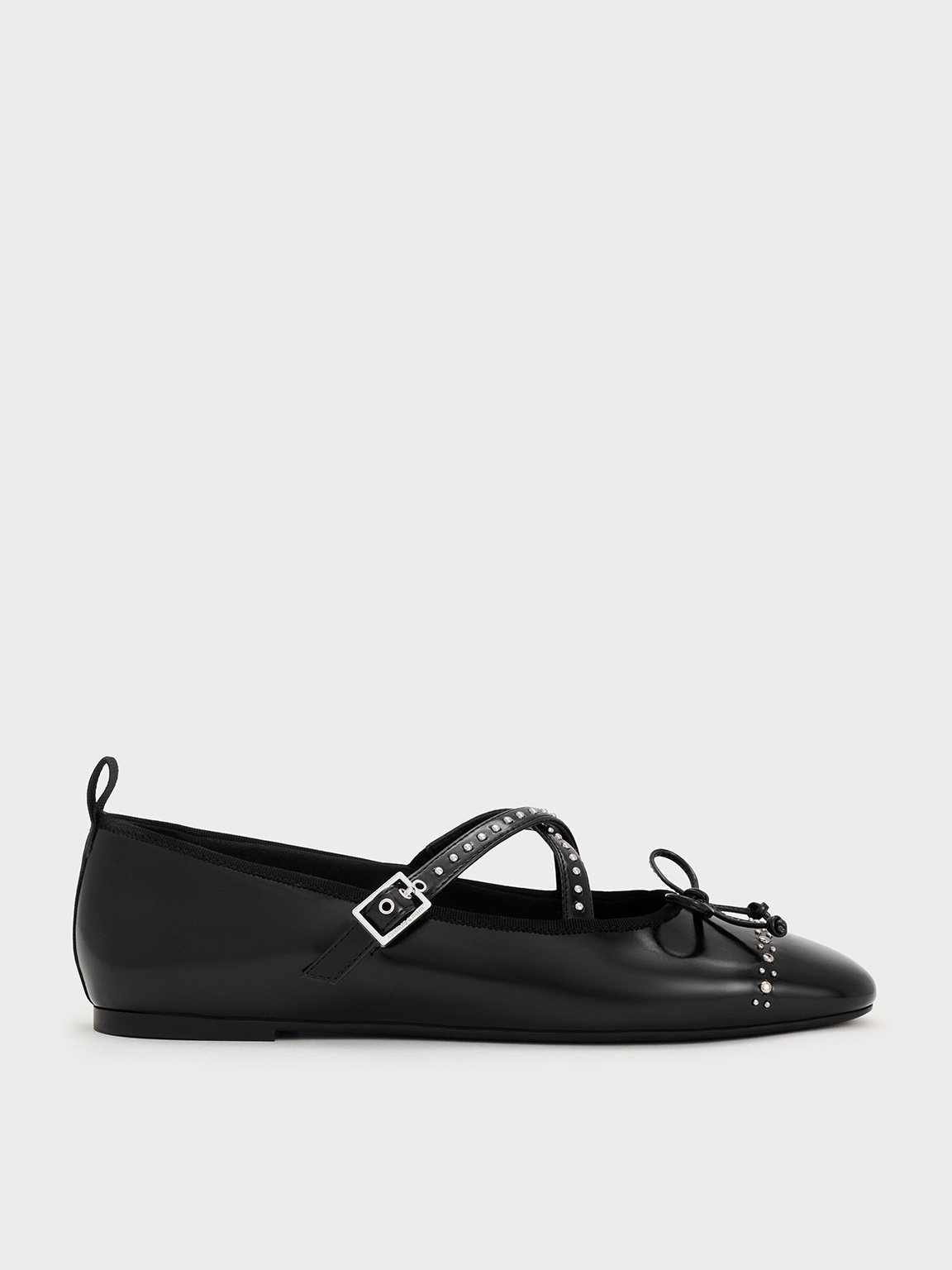 These striking Mary Jane flats give the classic shoe style a refreshing update. Embellished with silver-tone studs on the toe boxes and along the straps, this pair certainly puts an edgy twist on the original schoolgirl footwear. In glossy black, it is timeless and versatile — whether you dress them up or down, these shoes will still make a big impression and be the star of your outfit.