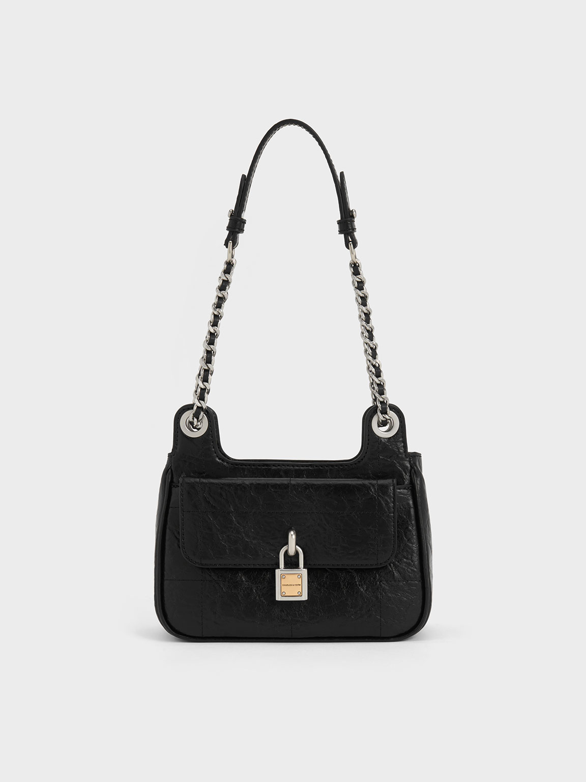 The Suki shoulder bag is a versatile accessory that will effortlessly set you apart from the crowd. Its wrinkle-effect textured finish in timeless black imparts a rugged quality to the carrier, elegantly complemented by the mixed-metals padlock detail. Equipped with a chain and faux leather strap and a roomy front pocket that will keep your important essentials easily accessible, the Suki strikes a perfect balance between style and functionality.