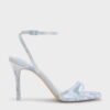 These heeled sandals in light pink feature an eye-catching swirl-print finish, slender ankle straps, slim asymmetrical-strap uppers, open square toes and stiletto heels. Let them pull together striking separates to create charming nights-out outfits that stand out.