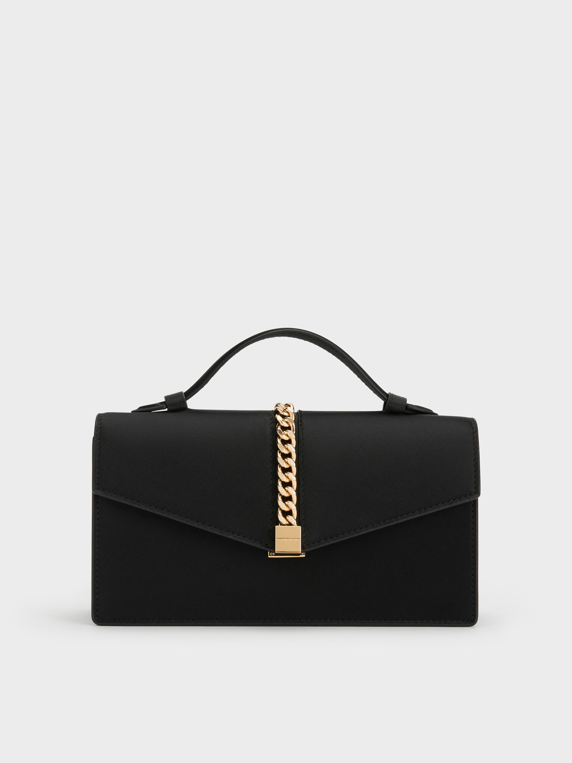 This Taisia envelope bag in black is made with satin and features a structured rectangular silhouette, a top handle and a chain detail at its centre. It also comes with a detachable chain-strap that allows you to carry it as a top handle bag, a clutch, or a shoulder bag.