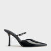 These mules in black feature a tapered square-toe design, thin buckled straps across the vamps, and distinctive flared stiletto heels. They will refine your weekday ensembles with their clean lines and sophisticated details.