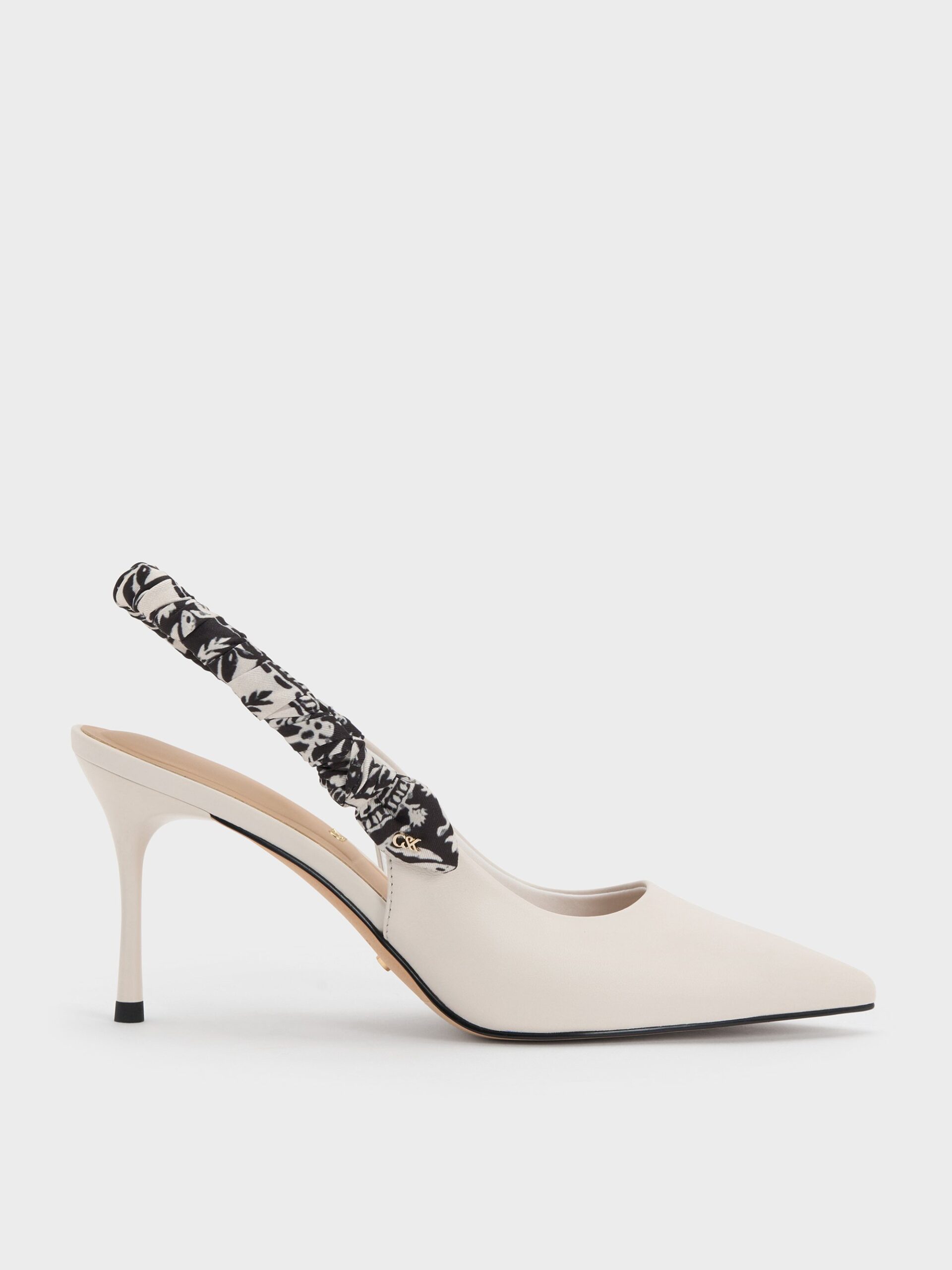 These Tayari slingback pumps in chalk are made with genuine leather and feature classic pointed toes and slender stiletto heels. Their slingback straps are wrapped in eye-catching printed fabric. They will ground softly structured ensembles with their clean, minimalist design.