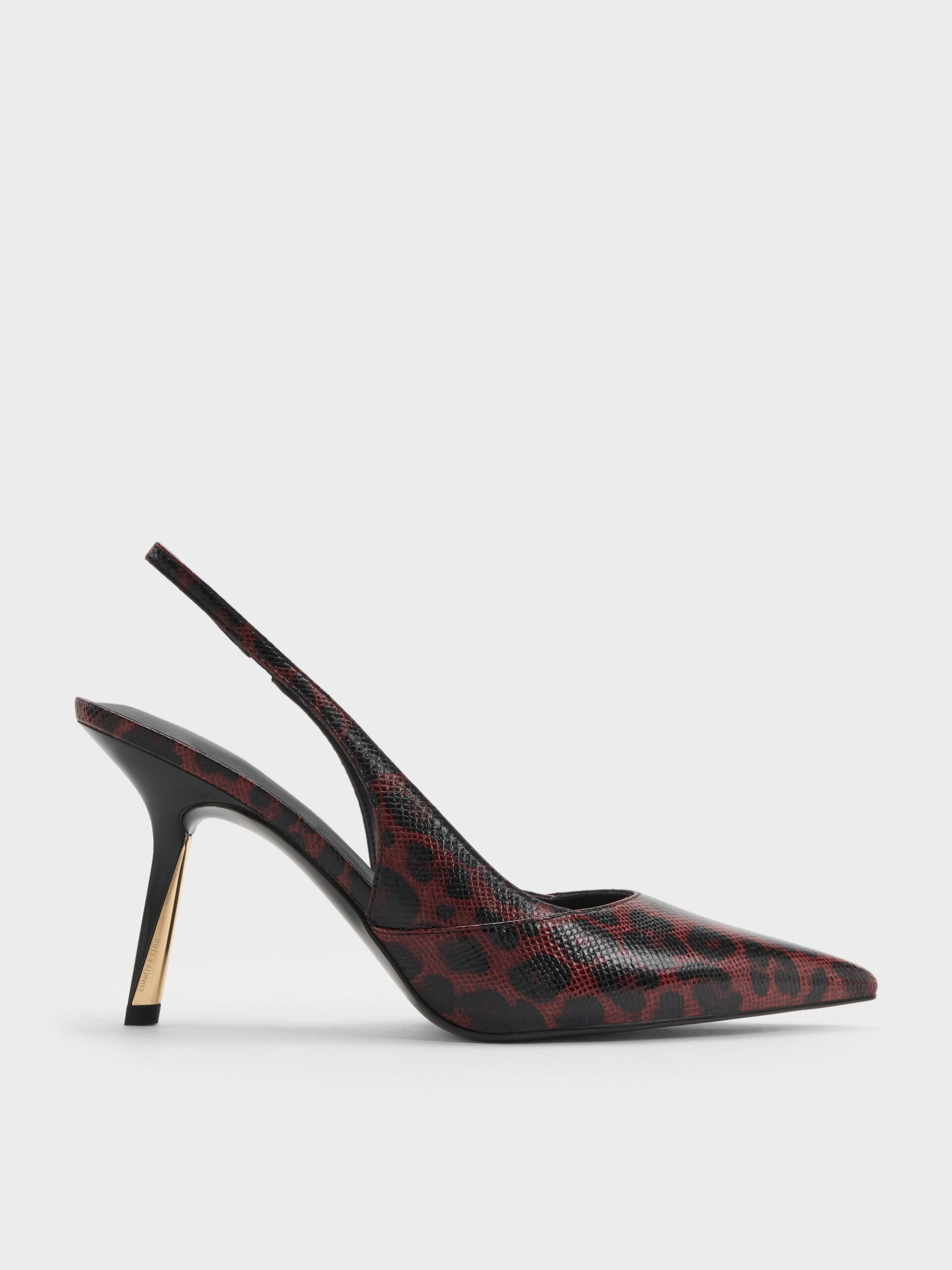 These Taylen slingback pumps in burgundy feature a leopard-print finish, sharp pointed toes, elasticised slingback straps and slender stiletto heels. Use them to tie together sophisticated neutral-tone outfits made for formal celebrations.