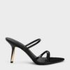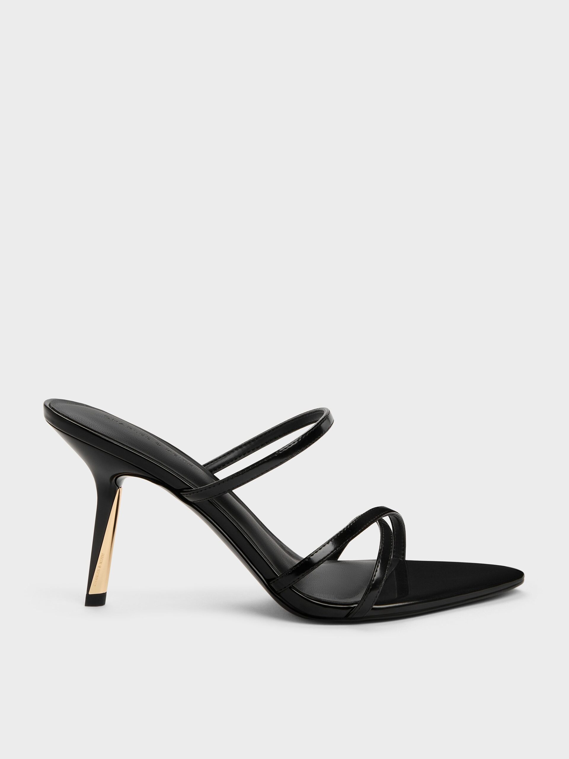 These Taylen heeled mules in black feature slim strappy uppers with a subtly glossy finish, open pointed toes, slender slant heels with polished gold accents. Let them bring stylish definition to relaxed jersey pieces and well-worn denim.