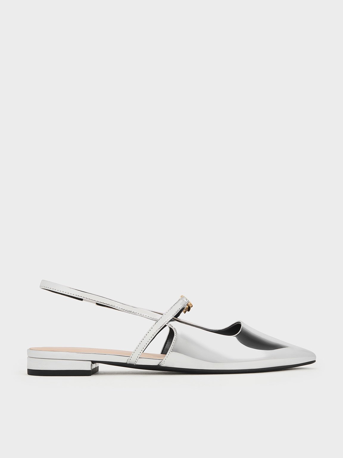 The mixed-metals aesthetic can extend to your footwear too, and these flats are a shining example. The high-shine mirror-metallic finish is complemented by gold-toned accents for a striking pairing that will make a glamorous statement. With its crisp pointed-toed profile, their polished appeal makes them suitable for upscale functions and elevated occasions. Set on low block heels that give the frame a flattering lift, they are an effortless pair that will make a big impression.