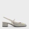 These Mary Jane pumps in grey are made with twill and feature bead-flower embellishments, slingback straps, block heels and almond toes. Wear them to bring elegant whimsy to both workday and weekend outfits.
