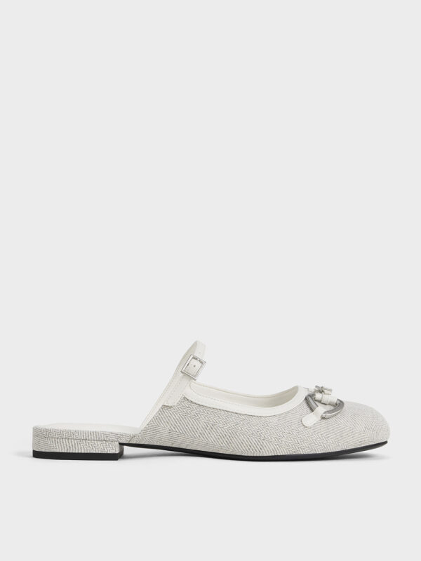 Bring a little more pizzazz to your everyday outfits with these mules. They feature an eye-catching grey chevron pattern contrasted with white trims — these are definitely shoes that will make you stand out. Offering ease of wear and great style mileage, their open-back design makes them a breeze to put on and take off. The buckled silver-tone accents give this pair a moderm, edgy appeal.