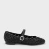 These Mary Jane flats in black feature woven uppers, thick straps across the insteps, silver square buckles, covered almond toes and flat soles. Let them complete your favourite warm-weather looks with effortless style.