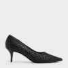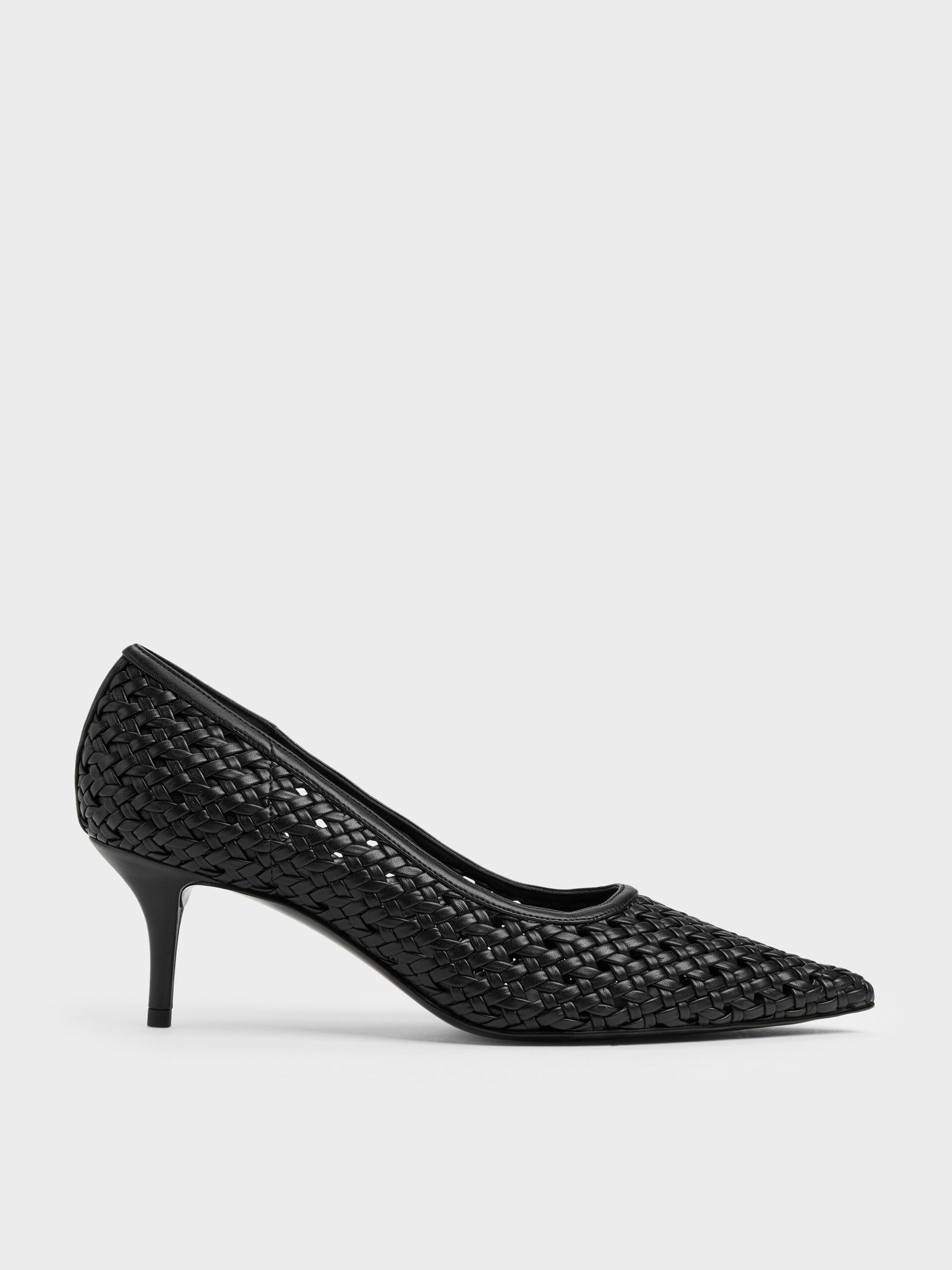 These pumps in black feature intricate woven uppers, elegant pointed toes, mid heels and cushioned heel pads for added comfort. Use them to add a tactile element to your polished workwear outfits during the summer.