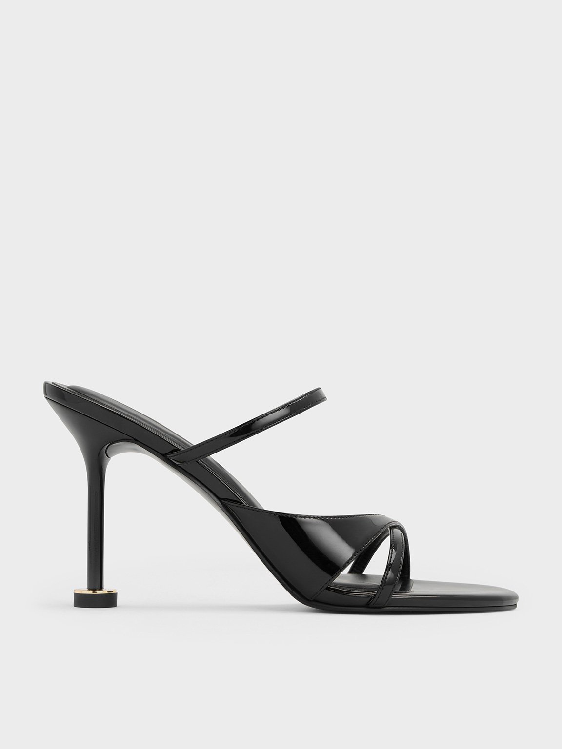From date nights to parties, these patent heeled mules in black will rise to any occasion. The asymmetrical strappy design is sleek and sophisticated while the slip-on design makes them a convenient choice. Set on sculptural heels, they will make you stand out from the crowd.